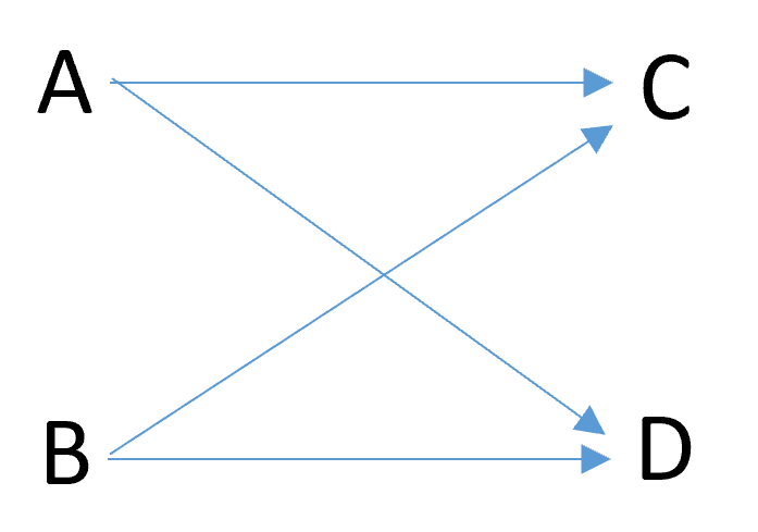例えば、語句の結びつきが、下図のような関係にある場合にこの「たすき掛けの用法」を使います。